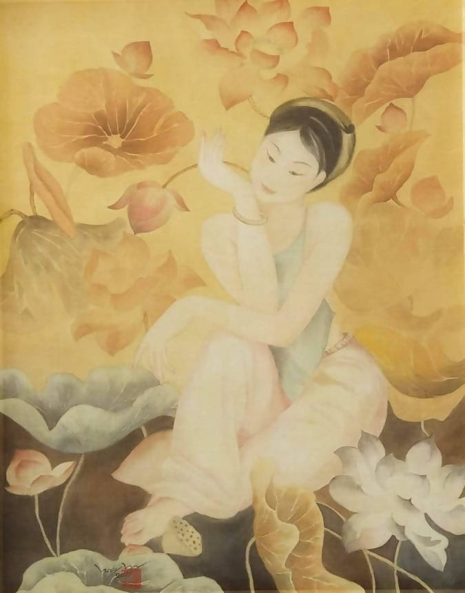 Tranh lụa vẽ chân dung thiếu nữ “Hương sen”
