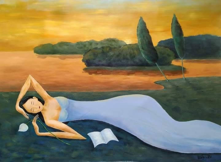 Tranh sơn dầu họa sĩ Nguyễn Quang Quý “Giấc ngủ chiều quê”