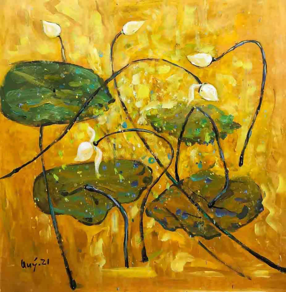 Tranh sơn dầu vẽ hoa sen họa sĩ Nguyễn Quang Quý “Giai điệu thu”
