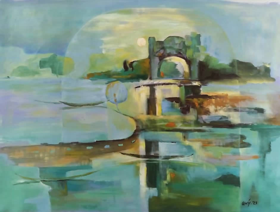 Tranh sơn dầu quê hương họa sĩ Nguyễn Quang Quý, tác phẩm "Trăng vàng cố đô"