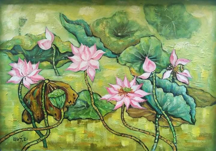 Tranh sơn dầu vẽ hoa sen “Trong nắng ban mai”